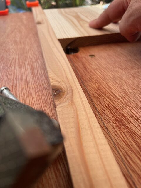 2_ビッドの端から1cmの位置に平行ガイド(フェンス)となる木材を設置し前後をクランプでしっかり固定する