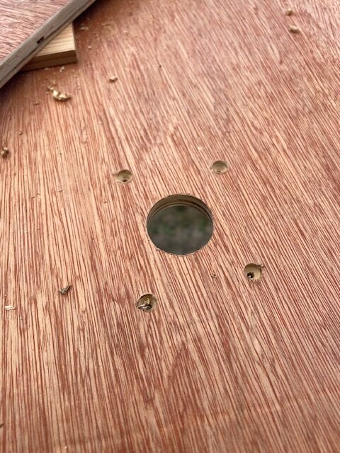 合板の中心にベースホルダーを置き、ビス穴とビッドが出る穴の位置に印を付けます。